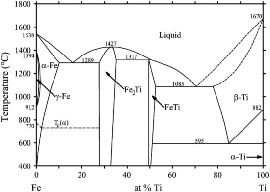 Table 2 determines the comparative analysis of the experimental compositions (from the phase diagram of Fe-Ti) and the calculated data under Equations (2) and (3).