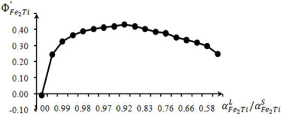 The Fe2Ti crystallization region and behavior of the osmotic coefficient of Bjerrum–Guggenheim on the ratio of activity should be studied using titanium. The initial data for the second crystallization region of the congruent Fe2Ti compound has been presented in Table 3. The thermodynamic characteristics to calculate the Schröder–Le Chatelier equation for the ideal system have been taken as described in [14,15] (ΔH 121,584.32 J/mol, Tm = 1700 K).