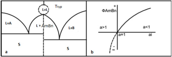 (a) The schematic display image of the phase diagram with formation of a complex chemical compound and the continuation of the liquidus line above the melting temperature on one and the other side of the AmBn compound; (b) the dependence diagram of the Bjerrum–Guggenheim coefficient near the melting point of the AmBn compound.