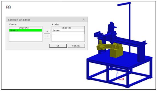 Figure 5 is a flow chart of collision inspection work. The movement of the LMD equipment model structure and the trajectory of the strengthened part surface are set for collision inspection, so that the LMD equipment model structure can detect the parts. After the setting is completed, collision inspection is required to be opened for testing. Otherwise, during PLC debugging, no warning sound will be issued for the collision between the digital twin structure of the LMD equipment and the movement of the print head, and the red indicator will be displayed for the overall collision structure. The collision detection between the remanufactured and printed working parts, and the digital twin structure of the LMD equipment, is beneficial to planning the processing trajectory and avoiding collisions caused by the processing trajectory. Figure 6 is a schematic diagram of the collision inspection of the LMD equipment model; Figure 6a shows that no collision has been detected, and Figure 6b shows that a collision has been detected and an alarm activated.
