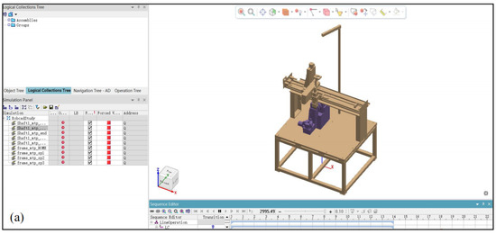 Figure 4 is a schematic diagram of the movement setting of the LMD equipment model. The movement setting of the equipment platform structure and the print head structure of the LMD equipment model is carried out. Firstly, the various components of the equipment platform and the print head are selected. The direction and speed of movement of the selected components are then set. From the left half of Figure 4a,b, it can be seen that the blue arrows are connected in turn, according to the transmission of the components, while the right half of Figure 4a,b, shows the component transmission setting. This part mainly includes the settings of the sequence, form, direction, speed, and acceleration of the equipment platform structure in X, Y, Z, and rotary axis components. The movement setting is conducive to the full integration of the physical conditions of each part of the LMD equipment model with the actual structure, thereby ensuring the success of the consistency of virtual and real.