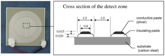 Carbon steel/silver ACM sensor used by Mizuno et al. []. Reprinted from Corrosion science, 83, Mizuno, D., Suzuki, S., Fujita, S., Hara, N. Corrosion monitoring and materials selection for automotive environments by using Atmospheric Corrosion Monitor (ACM) sensor, 217–225, copyright 2014, with permission from Elsevier.