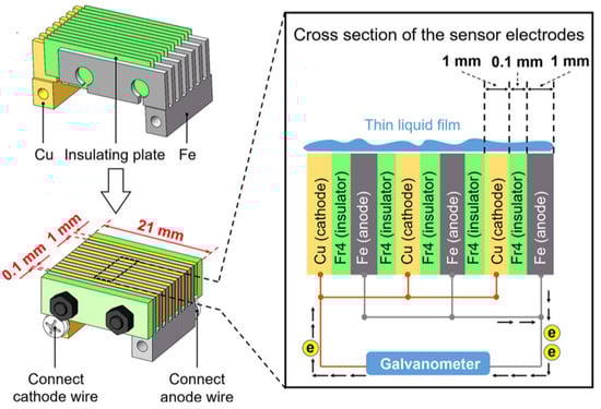 When two dissimilar metals are immersed in a conductive solution or electrically connected with a surface electrolyte layer, the potential difference between them leads to galvanic current generation []. This is the principle of galvanic corrosion sensors.