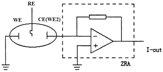In the potentiostatic EPN measurement mode, a potential difference is measured between two identical corroding electrodes or between a corroding electrode and a low-noise reference electrode. In the galvanostatic ECN mode, the current between two identical electrodes is recorded. These modes are not widely used for corrosion monitoring, as an electrode is polarised and EPN and ECN cannot be measured synchronously []. In the case of simultaneous potential and current noise measurement, the ECN is measured as a current between two working electrodes using a ZRA as shown in Figure 3, and the potential of the electrode couple is compared with the potential of a reference or third working electrode [,]. Generally, EPN is related to the corrosion mechanism, while ECN indicates its rate [].