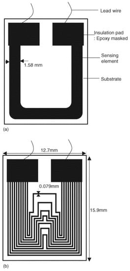 A schematic representation of the TFER sensors with (a) a single-line pattern and (b) a multi-line pattern []. Reprinted from Sensors and Actuators B-Chemical, 120, Li, S., Kim, Y.G., Jung, S., Song, H.S., Lee, S.M. Application of steel thin film electrical resistance sensor for in situ corrosion monitoring, 368–377, copyright 2007, with permission from Elsevier.