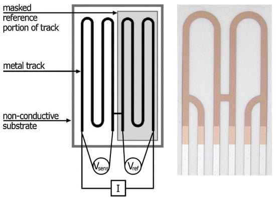 The sensing element’s resistance is measured by detecting a potential (voltage) drop while a small current is applied according to the Ohm’s law. The current is required to be very low so as not to affect sensor temperature []. The four-point probe method is used to increase the measurement accuracy []. It can be applied as a Wheatstone bridge comparing the unknown resistance of a sample with the resistance of three standards, or the probe voltage under a constant current can be recorded []. Conversely, Li et al. applied a potential difference of 20 mV across a steel sensor while continuously recording the current output [].