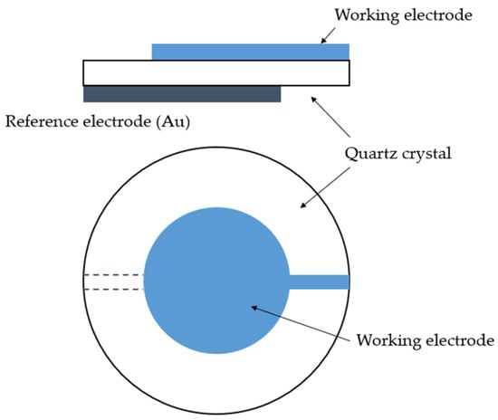 QCM consists of a thin plate of a single-crystal quartz with two electrodes affixed on each side of the plate (Figure 6). The crystal is made of SiO2 []. It has piezoelectric properties; i.e., it can generate electric potential as a response to applied pressure []. The material of interest is applied onto the crystal, which oscillates at its resonance frequency []. Any mass change in the oscillating device leads to a change in the oscillation frequency, which can be measured very precisely. For small mass changes, the frequency change is linearly dependent on the mass, and is converted into a mass change according to the Sauerbrey equation []: