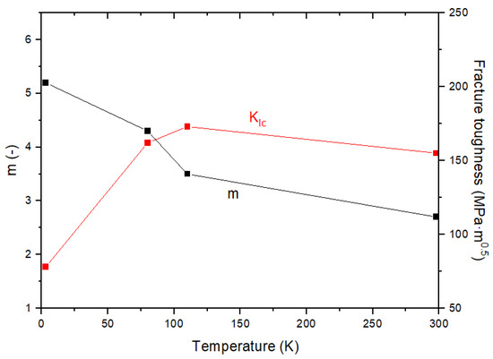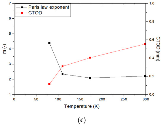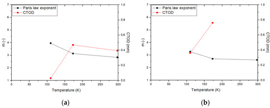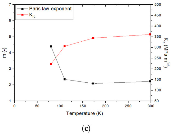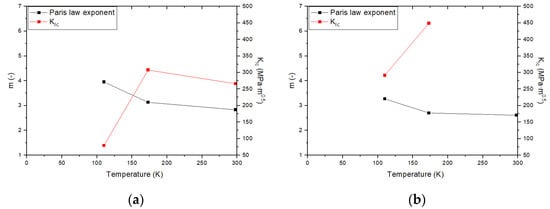 Below the certain temperature, the slope of da/dN—ΔK curve is steep. That is, the acceleration of fatigue crack growth may be faster as of the certain temperature (ductile to brittle). A ductile to brittle transition of fatigue has been called the Fatigue Ductile–Brittle Transition (FDBT) [9]. To assess the FDBT temperature, Tobler et al. have plotted the fracture toughness and the Paris law exponent (m) [10]. As shown in Figure 2, it shows that the slope of the da/dN—ΔK curve increases while the value decrease as of the FDBT temperature.