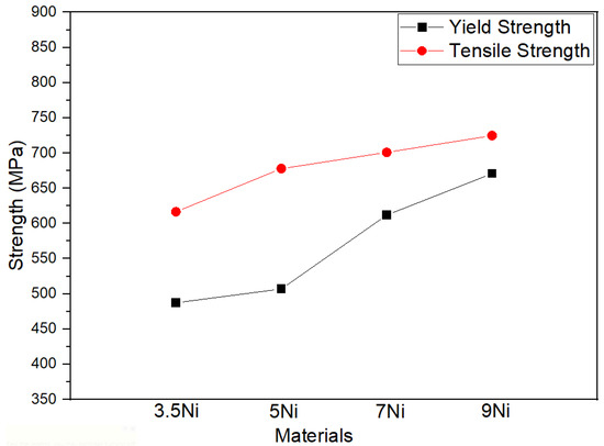 The mechanical properties of nickel alloy steels are summarized in Table 3. The mechanical properties of 3.5Ni were obtained by this study and those of other nickel alloy steels were extracted from the literature [20,21,22]. The variation of yield and tensile strengths with respect to various nickel contents is shown in Figure 3. As the nickel content increases, it shows a tendency to increase yield and tensile strengths.