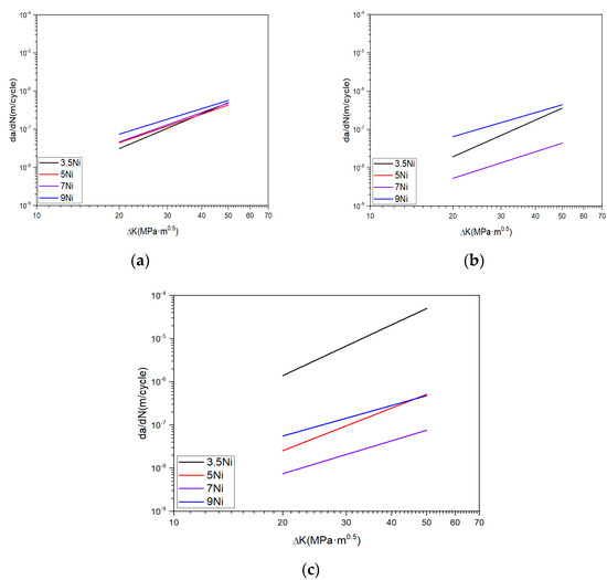 FCGR of various nickel alloy steels in Paris region are illustrated in Figure 7 [27]. All FCGR data are summarized in terms of stress intensity factor range between 20 and 50 . As shown in Figure 7a, the fatigue crack growth rate of nickel alloy steels decreases as nickel contents increase. In terms of FCGR, the start point, which is the linear crack growth according to ΔK of 9Ni, is lower than that of 3.5Ni at room temperature. Therefore, FCGR of nickel alloy steels increase while nickel content increase as shown in Figure 7a. At low and cryogenic temperatures, FCGR of 7Ni is the lowest compared to other nickel alloy steels as presented in Figure 7b,c. In addition, Figure 7c shows that FCGR of 3.5Ni appeared abnormally fast compared to other nickel alloy steels. This result is indicated that the fatigue crack growth characteristic of 3.5Ni become brittleness at cryogenic temperature. In Section 4, these results are analyzed in terms of microstructural and FDBT temperature.