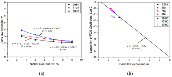 In cases of the low nickel content in the nickel alloy steel, the factor m, the slope of the FCGR, increases further with decreasing temperature in comparison with the high nickel content of the nickel alloy steel. At the same temperature, the factor m increases as nickel contents decrease. These tendencies are illustrated in Figure 8a. As shown in Figure 8b, material constants from FCGR are observed to locate within a single line except some data. With regard to the heat treatment process in nickel alloy steels, 3.5Ni, 5Ni and 9Ni preform quenching and tempering (Q-T). According to Figure 8b, the Q-T treated steels have linear relationship between Log C and m irrespective of temperature. Therefore, it is possible that the relationship between Log C and m can predict FCGR of Q-T treated nickel alloy steels. The simple mathematical model of material constants and nickel contents (N) are as follows: