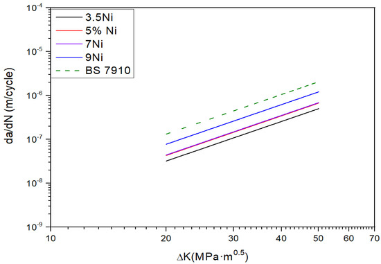 Figure 9 presents da/dN—ΔK curves of nickel alloy steel against the design curve suggested by BS 7910 [28]. Material constants for nickel alloy steel are summarized in Table 4. With the fixed slope of 3.0, material constant, C, of 9Ni is the highest compared to other nickel alloy steels. However, C value of 9Ni has about 58% lower than that in BS 7910 [28]. This implies that the C value in BS 7910 is very conservative to reflect the material constant associated FCGR of nickel alloy steels in efficient manner.