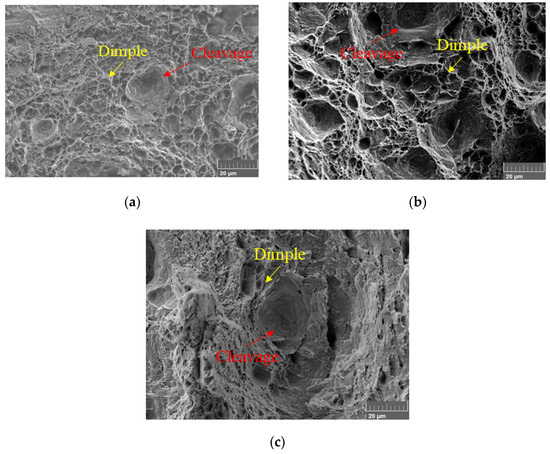 In this study, Figure 10 presents the dimple structure of fracture surface in order to discuss the fracture characteristic of nickel alloy steels. The dimple size of 3.5Ni is smaller than that of 9Ni as shown in Figure 10a,b. It is found that the dimple size is influenced by nickel contents. In terms of Figure 10b,c, the dimple size after the critical CTOD test at cryogenic temperature is smaller than that at room temperature. Therefore, the tendency of fracture toughness by nickel contents is reasonable according to analysis of dimple size.