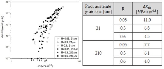 As mentioned above, it is confirmed that the growing prior austenitic grain size led to increase the fraction of retained austenite [2]. In addition, it is well known that the fracture toughness increases while the fraction of retained austenite increases [30]. As shown in Figure 12, the relationship between prior austenite grain size and FCGR was confirmed by existing paper. In case of the region of low ΔK, FCGR increases and decreases as prior austenite grain size increases [31].