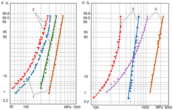 Statistical distribution curves for mechanical properties of steel 15Cr2MoVA: random value X′ (straight lines) and random value X″ (dashed lines); 1—σy, 2—σpr, 3—σu, 4—Sk.