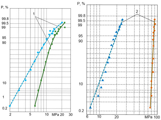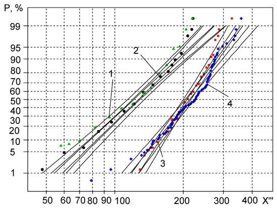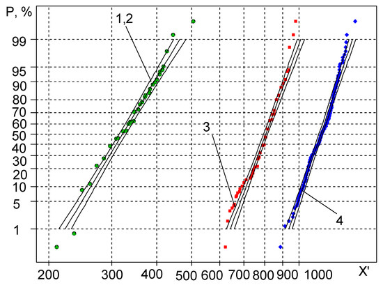 A similar distribution has been observed for the mechanical properties of the other two materials. The graphic distribution view of the probability plot would suggest the following conclusions: due to greater scattering, distribution curves for random measure X″ are more sloped and differ considerably from the expected straight line. This contradicts the statement that, where the sensitivity threshold is used for statistical investigation, the statistical distribution graphs should be very close to straight lines [38]. Several patterns could be observed during the analysis of the calculated statistical properties (Table 6) for the structural materials analyzed (steels 15Cr2MoVA, 45 and aluminium alloy D16T1), characterized by different cyclic properties (cyclically hardening, cyclically stable, cyclically softening). Taking into account sensitivity measures N0 and Nk, for the statistical distribution of the mechanical properties, statistical parameters of the statistical distribution of all mechanical characteristics—statistical distribution skewness S, coefficient of variation V, as well as the kurtosis Ex—have been observed to develop fairly high values different from zero. This indicates that sensitivity thresholds N0 and Nk affect agreement of statistical distribution to the logarithmic—normal law instead of supporting the agreement.