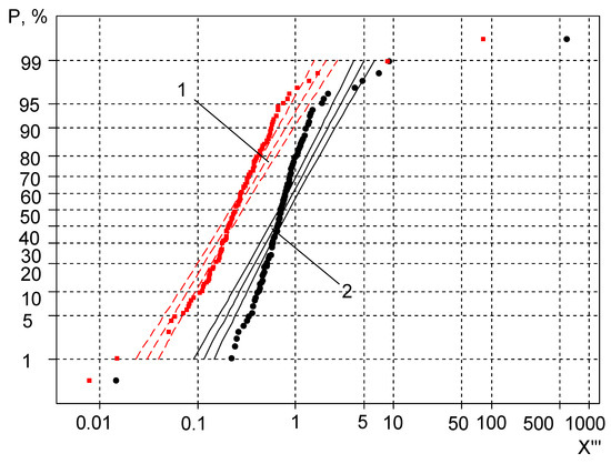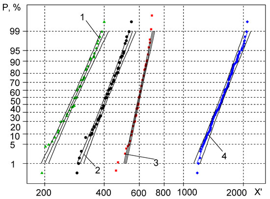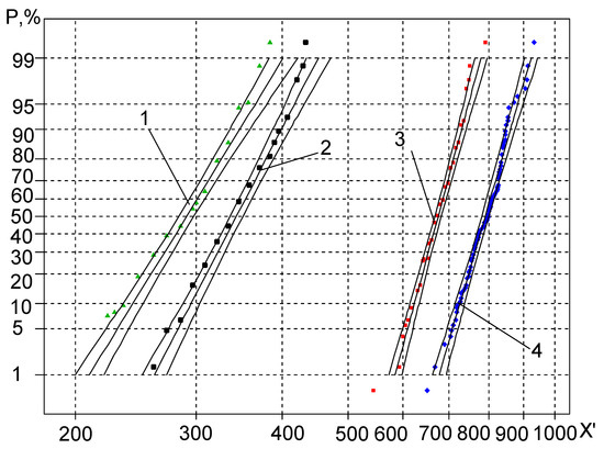 In the review of the results of the multicycle fatigue durability test [38] a deviation from the normal distribution has been observed with a low characteristic of the distribution of the analysed random value X′ = lgNi has been noted. The probability of failure duration points marked in the coordinate system comprises the upward bent curves. Meanwhile, in the case of the theoretical normal distribution, the points are expected to form straight lines.
