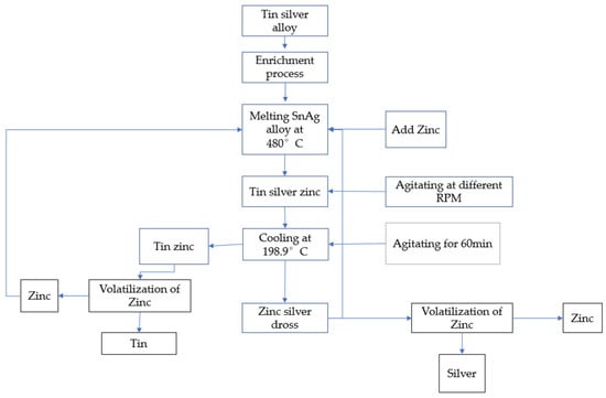 According to the above binary phase diagrams, zinc was added at a temperature range of 450 °C to 500 °C, where different silver zinc intermetallic compounds such as AgZn3, Ag5Zn8 and AgZn can be formed, and the dissolution of zinc in tin silver alloy in that temperature range was evaluated. The eutectic point of tin zinc alloy was 198.9 °C (Figure 4). This implies that if zinc is added and agitated between 450 °C to 500 °C, different silver zinc intermetallic compounds will be formed to be removed as dross at a temperature of 198.9 °C where tin zinc alloy is formed. This study was limited to the separation silver to obtain silver zinc, and an experimental chart of the whole experiment is shown below (Figure 6).