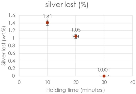 The whole process involved separating silver from tin silver alloy. This was done by adding zinc to tin silver alloy, and zinc was selected based on the tin silver and tin zinc phase diagram. In the cooling process, tin zinc and zinc silver dross were formed. Zinc silver dross was removed using a skimming process. Melting of tin silver alloy at a temperature of 400 °C, which is above the eutectic point of tin silver alloy to lead to the removal of different impurities including tin, as shown in Figure 7. Due to the increase in tin liquid metaphase (tin normally melts at 231 °C), there no silver was lost at a holding time under 30 min. As we increased the holding time past 30 min, melted tin and impurities increased (Figure 8) and were removed to leave enriched tin silver alloy Figure 9.
