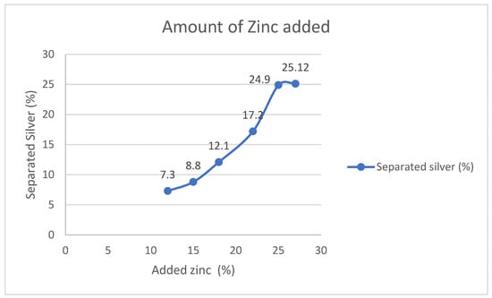 Amount of separated silver depending on amount of zinc added at 480 °C: first silver separation, cooling temperature of 198.9 °C, agitation rate of 400 RPM.