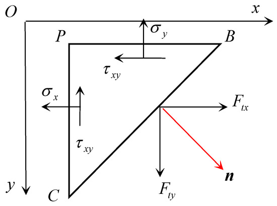 The surface force on the slant BC is decomposed into , the direction chord of the outer normal of the boundary BC is denoted by . It is stipulated that the direction of the surface force component is positive in accordance with the coordinate direction, and negative on the contrary. The mechanical equilibrium equations are established along the x and y directions, respectively, and it can be obtained that