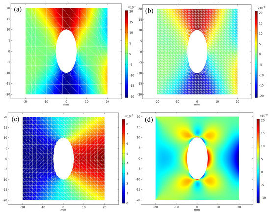 In Formula (21), represents the volume of the element , represents the boundary of the element . The three items on the right side are volume force, surface force and concentration force. is the node of variation displacement, and after both sides are eliminated, we can obtain Equation (22):