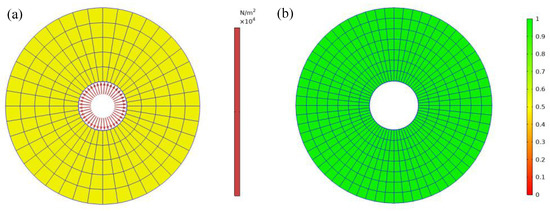 Boundary conditions include displacement boundary and force boundary conditions [43,44]. for the geometric space of deformations, the outer surface is surrounded by displacement boundary and force boundary without overlapping, which is related , is an displacement boundary, is a given force boundary.