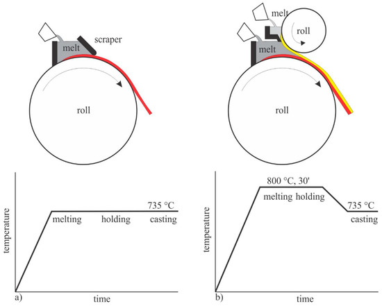 Schematic presentation of casting methods and melting and casting procedures for (a) single-roll casting and (b) twin-roll casting.