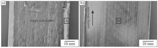 Figure 2 shows the surfaces of the cast strips. The surfaces formed in contact with the rolls were relatively smooth, with lines parallel to the casting direction (Figure 2b). No differences were observed between the surfaces of the twin-roll-cast strip and single-roll-cast strip. On the other hand, the free surface of the single-roll-cast strip was rougher, especially in the central part (Figure 2a). A scraper is typically used to make the free surface smoother [29].
