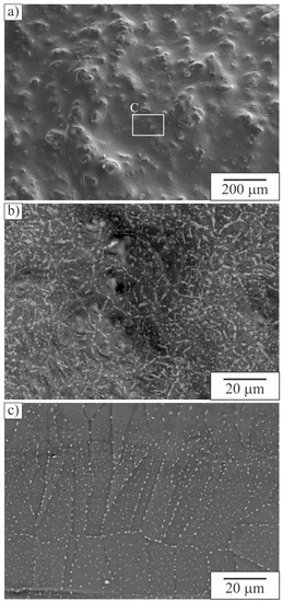 Surfaces of the single-roll-cast strips. (a) Secondary electron image (SEM) of the free surface with asperities (Area A in Figure 2a). (b) Backscattered electron image of the free surface with asperities (SEM) (Area C in Figure 3a). (c) Backscattered electron image (SEM) of the surface in contact with the roll (area B Figure 2b).