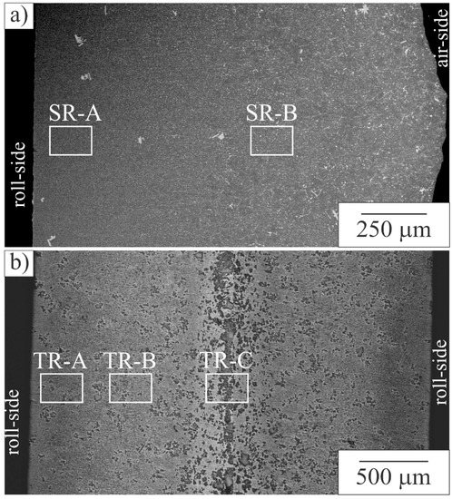 The low magnification images of the Al-Mn-Cu-Be alloy: (a) single-roll-cast strip (SEM backscattered electron image) and (b) twin-roll (TR) casting (LM). Brighter areas in Figure 4a and darker areas in Figure 4b represent coarser intermetallic particles. The indicated regions SR-A, SR-B, TR-A, TR-B and TR-C were analysed in details, and are explained in the text.