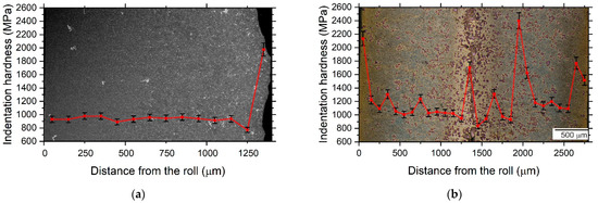 The indentation hardness (Vickers pyramid, maximum load 1000 mN, distance between indents 100 µm) in the strip manufactured by (a) single-roll (underlying SEM micrograph) and (b) twin-roll casting (underlying LM micrograph).
