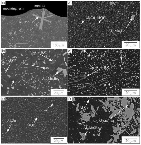 The variations in microstructure were more pronounced in the twin-roll-cast strip (Figure 6d–f). The microstructure at the roll side was (TR-A) was similar to the microstructure in SR-A. However, Al15Mn3Be2 particles were present more regularly. The volume fraction of particles was about 15%, and their sizes were 0.92 ± 0.63 µm. The large areas of interconnected (α-Al + IQC) eutectic occupied the interdendritic regions in the area TR-B. At the centre (TR-C), large Al15Mn3Be2 were agglomerated into a central belt, often incorporating Be4Al (Mn, Cu) particles, their volume fraction was close to 20%. In this region, small α-Al grains were present (linear intercept length was 7.3 ± 1.3 µm). On the other hand, the crystal grains in the other regions were much larger (238 ± 80 µm × 63 ± 27 µm).
