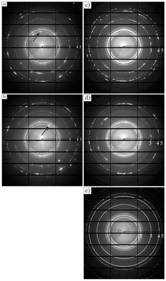 X-ray diffraction was performed at synchrotron Elettra (Elettra, Trieste, Italy), using X-rays with a wavelength of 0.0999996 nm. XRD images were taken in transmission mode at 24 °C. The samples were in the form of thin plates with thicknesses of 200–300 µm. The sampling area was 500 m × 500 µm. The 2D images were collected using Dectris Pilatus 2M camera (Dectris Ltd., Baden-Daettwil, Switzerland) at a working distance of 100 mm. LaB6 powder was used for calibrating the image. The 2D images were transformed to X-ray patterns: intensity I versus diffraction angle 2Θ by using software Fit2D V12.097 (ESFR, Grenoble, France). Programs CrystalMaker 9.2.8 (CrystalMaker Software Ltd., Oxfordshire, UK) and CheckCell (Jean Laugier & Bernard Bochu, Saint-Martin-d’Hères, France) were used for the data processing and analysis of the results.