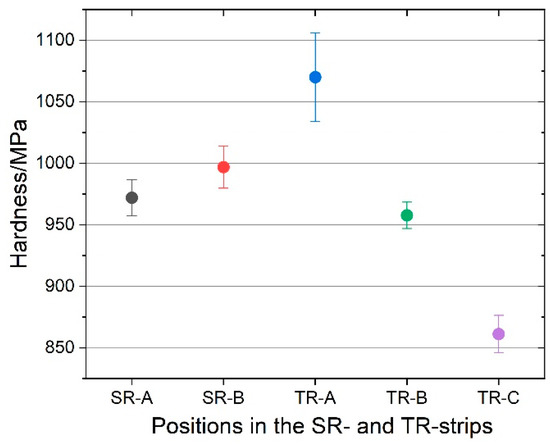 The hardness in the area TR-A was harder than in both areas in the SR strip, probably due to smaller crystal grains of α-Al. The hardness in the region TR-B was similar to that in SR strip. The small grains at the centre of the TR strip (area TR-C) possessed the lowest hardness because only low fractions of IQC and Θ-Al2Cu were present at the grain boundaries.