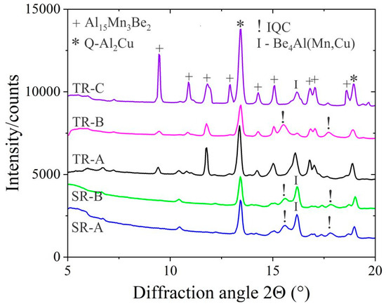 Additional information can be obtained from the 2D-XRD images (Figure 7). The labels 1–5 indicate the reflection positions for (111), (200), (220), (311) and (222) α-Al planes. The discrete diffraction spots, one spot in each image, is pointed to by the arrow, indicating that only a small number of α-Al grains are diffracted. Thus, large grains of α-Al were present in both areas, with minute differences from one another (they have elongated shape with sizes 164 ± 44 µm × 62 ± 21 µm). Other rings were continuous, signifying that other phases were present as small and randomly oriented particles. Their positions corresponded to Θ-Al2Cu and IQC (Figure 9). The IQC peaks are rather broad. Broad peaks are caused by small particles and the presence of many structural defects, which is typical for metastable IQC phase in Al alloys [32]. The peaks of Al15Mn3Be2 were not observed in the diffraction patterns, presumably due to their too low volume fraction. This was in accordance with the observed microstructures. The hardness in the areas free of large particles did not differ much in areas SR-A and SR-B (Figure 8).