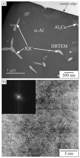 Figure 10 and Figure 11 display the TEM micrographs of the icosahedral quasicrystalline phase and Al15Mn3Cu2 phase with high-resolution images (HR-TEM) and Fast Fourier Transforms (FFT). The investigated IQC particle was in the interdendritic region (Figure 10a). The HR-TEM image of IQC shows the structure taken along a fivefold symmetry axis. The FFT shows the fivefold diffraction pattern, which is typical for the icosahedral quasicrystals. Namely, the diffraction spots form five sets of virtual parallel lines with a mutual orientation of 72°. The distance between diffraction spots increased with τ (golden mean ≈ 1.618), which is also typical for quasicrystals.