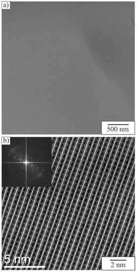 The quasicrystalline approximant particles Al15Mn3Be2 were huge, so the investigated lamella was just a part of a single particle (Figure 11a). The HR-TEM image was taken along a twofold zone axis. Fast Fourier transform revealed a hexagonal structure, and XRD analysis give a unit cell with the lattice parameters of a = 1.227 ± 0.003 nm and c = 2.453 ± 0.008 nm.