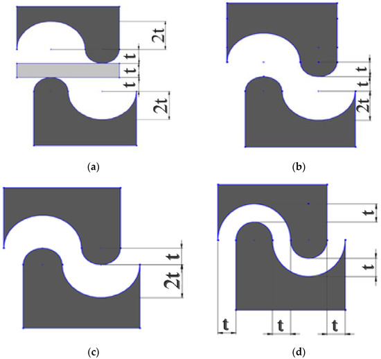 Schematic asymmetric semicircular studs proposed as a modified-CSP method, (a) initial contact with the sheet surface, (b) moving dies as much as the thickness of the sheet, (c) moving dies twice the thickness of the sheet, and (d) moving dies three times the thickness of the sheet. (thickness of the sheet is based on millimeters).