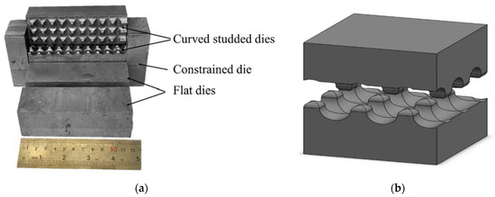 Since the geometry of the sheet must be fixed at the end of the corrugation step, the position of the modified-CSP dies is shown based on the sheet thickness (t) in Figure 1a–d. Figure 1a shows the initial contact of the dies with the surface of the sheet. In Figure 1b, the top die is moved vertically to the sheet thickness. In Figure 1c, the top die is moved twice the sheet thickness. According to Figure 1d, the top die has moved three times the sheet thickness. In fact, according to Figure 1d, the space between the dies will be exactly equal to the sheet thickness. Moreover, the sheet thickness remains constant at the end of the plastic deformation. As a result, the maximum displacement of the upper die will be three times the thickness of the sheet. Figure 2a shows an image of the modified-CSP studded and flat dies. Figure 2b illustrates a 3D image of the modified-CSP dies.