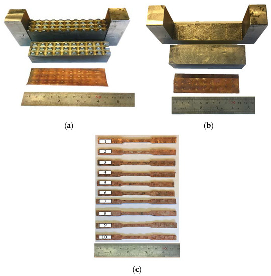 Figure 3 shows the corrugation and flattening dies in the modified-CSP method and the sheets produced in this process. The corrugation dies, flattening dies, and the annealed, corrugated, and straightened sheet samples produced in the first pass of the modified-CSP process have been illustrated in Figure 1a,b, respectively. The uniaxial tensile test samples were prepared according to the ASTM-E8M standard (Figure 3c). The testing was performed by an STM-150 device at room temperature and at a speed of 0.1 mms−1 (initial strain rate of 5 × 10−3 1/s). In order to calculate the average results for each pass, each tensile test was performed three times. MH4 Koopa was used to perform Vickers microhardness experiments. The Vickers microhardness test was implemented at equal distances of 1 mm from the edge of the sheet on surface of the sheets. From each pass, one sample was prepared for the Vickers hardness test. A 1kg load was applied for 10 s in all hardness measurements. The obtained hardness number values had an average of at least 10 measurements at different points on the surface of sample.