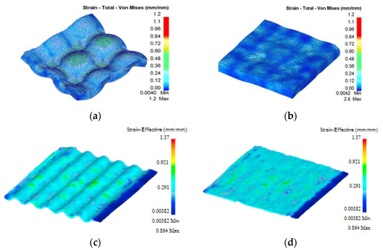 Figure 4 shows the distribution of effective plastic strain for the first pass of the modified-CSP process and CGP process from Ref. [16]. According to Figure 4a,b, the maximum effective plastic strain at the corrugation and straightening steps for the modified-CSP process were about 1.2 and 2.8, respectively. According to Figure 4c,d, the maximum effective plastic strain at the first step for the CGP process from Ref. [16] were about 0.864. As in Figure 4b,d, unlike the CGP process, which occurs in the modified-CSP process, the strain localization will substantially decrease, mainly due to elimination of sharp edges and interface regions. Moreover, in accordance with Figure 4b and compared to the straightening step in the CGP process, strain localization is relieved in modified-CSP dies, so the strain is more homogeneous than it was expected. Furthermore, the maximum and minimum effective plastic strain after the straightening step in modified-CSP were smaller than that in the counterpart straightening step in CGP. It was due to the reduced areas that were associated with strain localization, such as interface regions and sharp edges. According to Figure 4c, the interface region simultaneously suffers stretching and bending deformation. Thus, due to existence of the interface region, it will result in inhomogeneous strain distribution at the CGP sample [16,17].