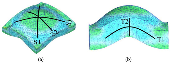 In order to investigate the homogeneity of effective plastic strain during the first pass of the modified-CSP process, which includes the corrugation and straightening steps of the sheets, five directions were considered on the surface and thickness of the sheet. Figure 5a,b represent the directions on the surface and thickness of the sheet, respectively. According to Figure 5a,b, the S1, S2, and S3 directions on the sheet surface as well as T1 and T2 along the center and across the thickness were considered, respectively.