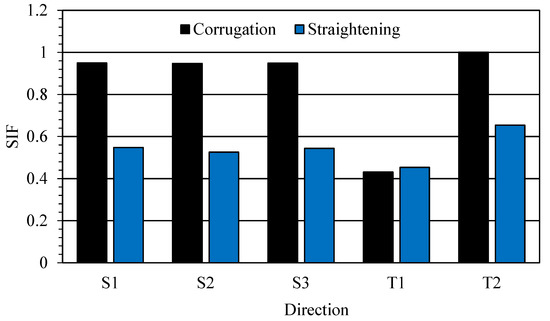 Variations of SIF along five directions (S1, S2, S3, T1, and T2) for the corrugation and straightening steps of the first pass for modified-CSP.