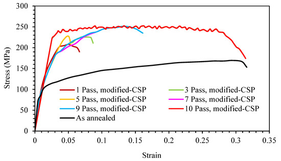 Stress-strain curves for as annealed, first, third, fifth, seventh, ninth, and tenth passes of the modified-CSP samples.