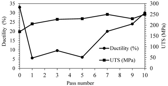 Comparison of the ductility and UTS values vs. the modified-CSP passes.