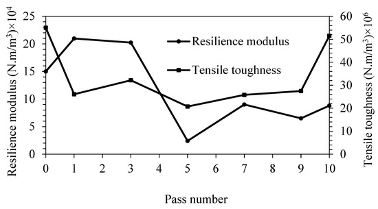 Comparison of resilience modulus and tensile toughness values of modified-CSP samples for each pass.