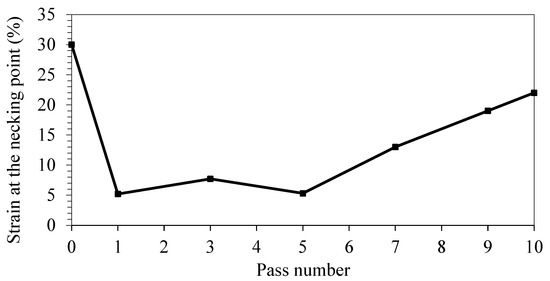 Figure 10 shows the amount of strain at the necking point in the tensile test of modified-CSP samples. In the first pass, strain at the necking point dropped significantly by about 82.6%, as compared to the annealed. The strain values at the necking point from the first to the fifth passes samples did not change significantly; however, the strain values at the necking point of the third and fifth passes were about 7.7% and 5.3%, respectively. Afterwards, the strain values at the necking point in the seventh to the tenth passes increased. The strain value at the necking point shows plastic instability. The onset plastic instability occurs in the weakest region, which is called the necking point. The Considère stability criterion is as follows [1,30]: