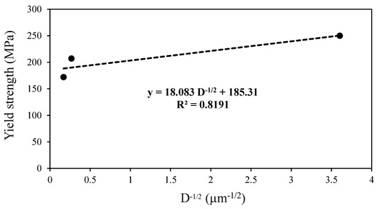 where is the yield strength, is the yield constant, and is the frictional stress. According to The Hall–Petch relationship, when the grain size decreases, the yield strength increases. In the Hall–Petch effect, it is assumed that the grain boundaries block the dislocation movement. Figure 11 shows variations of the yield strength versus the reciprocal square root of the grain size. The linear relationship indicates the intercept and the slope are 185.31 MPa and 0.018 MPa.m1/2, respectively.