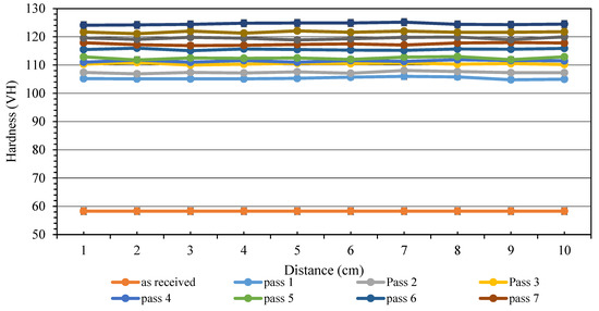 Figure 12 represents the direction of Vickers microhardness measurement with 10 points on surface for the first pass of the modified-CSP sample. A similar path was selected for the annealed and modified-CSP samples from the second to the tenth passes. Figure 13 shows the distribution of Vickers microhardness along the direction illustrated on Figure 12 for the as annealed and modified-CSP samples.